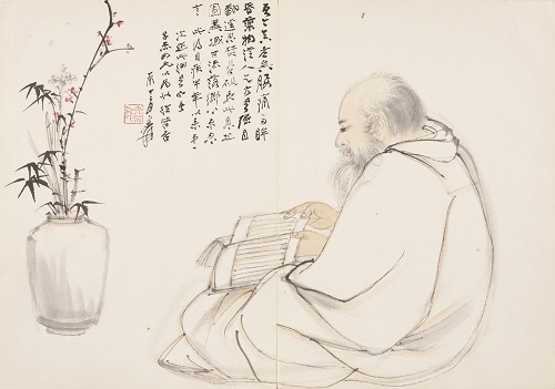 「真實與想像的建構」則透過勾勒名人形象的相關物件,及描繪典籍傳說的虛擬角色作品,展現物件被賦予的人格詮釋與象徵。如張大千《以寫我憂》自畫像,繪寫畫家正在讀書的身影,落款詩作亦透露畫家心境;「畫狂人」葛飾北齋(1760-1849)巧妙融合「花和尚魯智深」、「武藏坊辨慶」、「狐嫁入(狐出嫁)」三主題於同一畫面的《北齋漫畫》單頁版畫等。