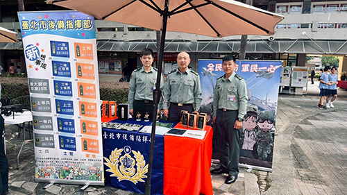 特展會場由台北市後備指揮部協助統合三軍單位,並由國防部北部地區人才招募中心規劃,設置10個全民國防暨人才招募宣導攤位,透過熱情活力的國軍娃娃拉近與學生距離,再由各軍種招募員針對國軍招募政策暨職涯規劃等資訊向學生說明,參訪學子均獲益良多,此外,國防部資通電軍指揮部安排訓練型、偵搜型無人機裝備展示,陸軍特種作戰指揮部透過傘具介紹與背負體驗,及國防部憲兵指揮部規劃T91步槍及紅隼火箭彈雷指器射擊體驗活動,增進軍民互動,深化青年學子國防教育知識,了解國家安全重要性,進而關注、支持全民國防,提升愛國情操,更進一步鼓勵學子落實全民防衛動員,實踐保衛家園目標。