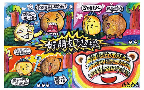 在國小組作品中,學生以生活視角回應性別議題,呈現兼具童趣與深度的創作力。天母國小低年級陳同學以明信片致意《我先生是最美檢察官》角色「樂樂律師」,從其自信與專業形象呼應「性別無界限、展現真自我」主題,展現對性平角色的敏銳觀察。大理國小曾同學以四格漫畫聚焦「身體自主權」,以同儕互動情境提醒尊重界線與「說不的重要」,以簡潔情節傳達「親密也要有界線」的核心價值。文化國小莊同學的「自由之名」發話筒鼓勵尊重差異、勇於思考;再興國小余同學以「彩色的自我」象徵接納多元、自在綻放。整體作品展現性平教育向下扎根,孩子在創作中理解尊重、同理與界線意識,為未來在多元社會中自信成長奠定基礎。