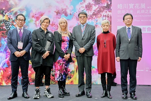 圖 /當代藝術家蜷川實花親自來台參與佈展並出席《蜷川實花展 with EiM:彼岸之光,此岸之影》開幕記者會(由左至右:特別協贊株式會社BUFFALO常務執行董事横井一紀、數據科學家/EiM製作人宮田裕章、當代藝術家蜷川實花、主辦單位聯合數位文創董事長李彥甫、主要贊助台新新光金控代表台新銀行文化藝術基金會執行長鄭雅麗、特別贊助中華汽車工業股份有限公司副總經理廖景雲)。(聯合數位文創提供)