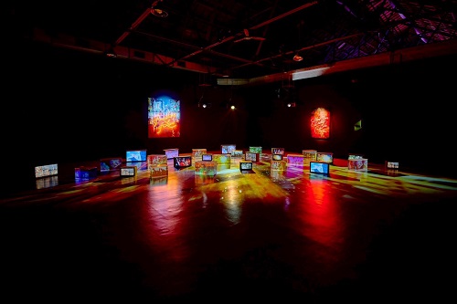 圖 / 展區《生命的呼吸》濃烈的霓虹燈光與水箱裝置,呈現都市的生命氣息。(聯合數位文創提供)