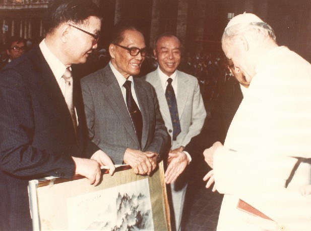 圖 /1979年5月30日時任史博館館長何浩天(左1)偕同黃君璧(左2)與姚夢谷(左3),於羅馬教廷廣場前致贈畫作與教宗(右1)