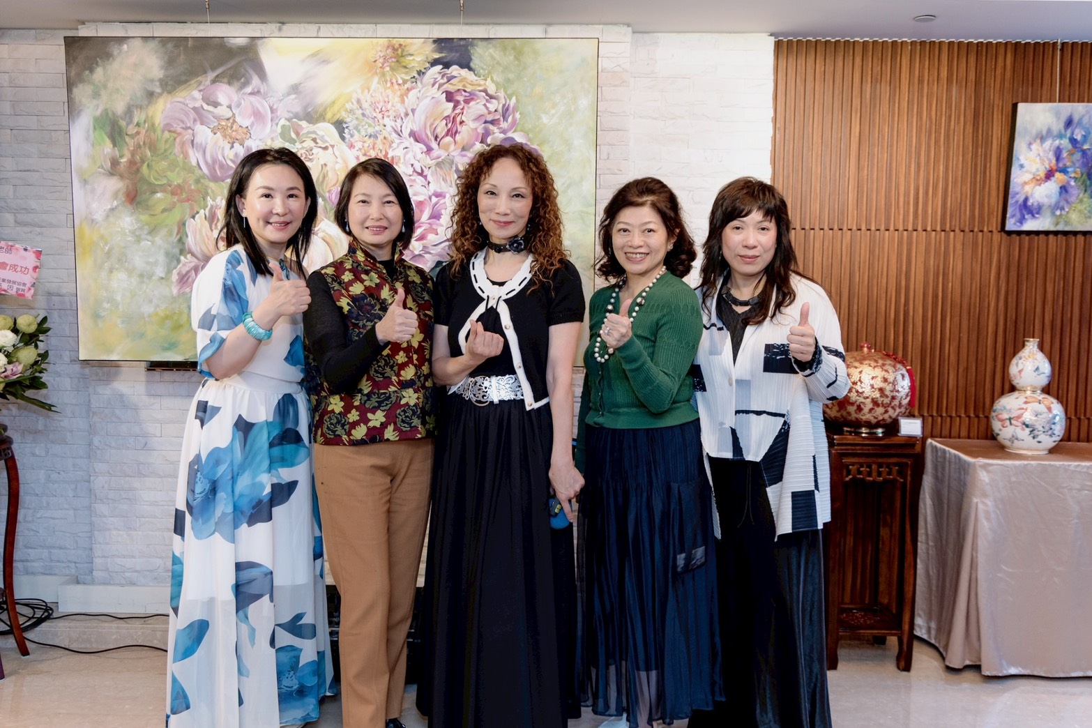 左起:1、中華藝術鑑賞交流協會理事長/陳力瑜2、中華國際樂齡健康產業發展協會理事長/孫因3、藍月芳華藝術創作有限公司/藍月老師4、香樹花園酒店總監/邱樂芬5、光行創藝執行長策展人/王意文(照片提供 藍月 藝術老師)