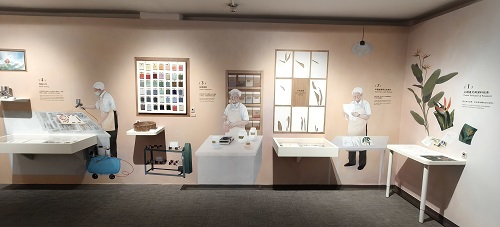 圖 /「窯變.釉韻─范振金特展」空間造景重現藝術家工作室與釉藥教學現場史博館說明,范振金(1938–)出生於花蓮吉安,歷經師範教育的啟蒙與國立藝專(今國立台灣藝術大學)的專業養成,在林葆家、吳毓棠、王修功等陶藝前輩指導下,逐步掌握複雜的釉藥知識。本展精選范振金34件作品,以「釉彩的知識與風景」為主軸,規劃四大單元「島嶼的低語—風景啟蒙之章」、「窯焰鑄夢—台灣山水的重生」、「生靈的頌歌—花鳥萬物的擁抱」及「星河的律動—宇宙光影的追尋」。范振金以平面的陶板作為畫布,結合傳統陶藝與現代油畫、版畫技巧,以噴、灑、描、繪等多重技法,讓水墨的瀟灑、油畫的濃韻與工筆的細膩,巧妙地在釉彩的光亮、流動、結晶與冰裂之間交融。