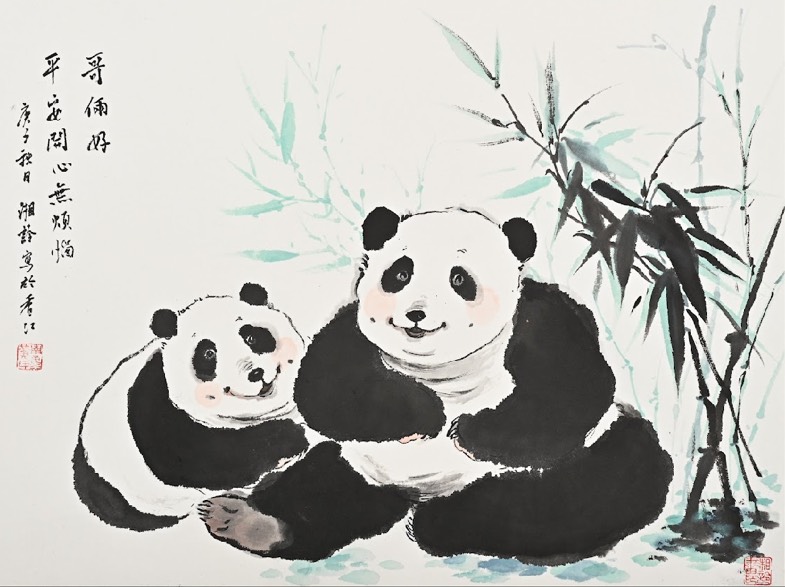 黃湘詅最具代表性的熊貓系列作品,以溫潤筆觸描繪親子相依的純真情感,傳遞「平安、喜樂、無憂」的美好祝福,為觀者帶來療癒人心的溫暖力量。(照片提供 白雲堂藝術硏究會/黃湘詅工作室)