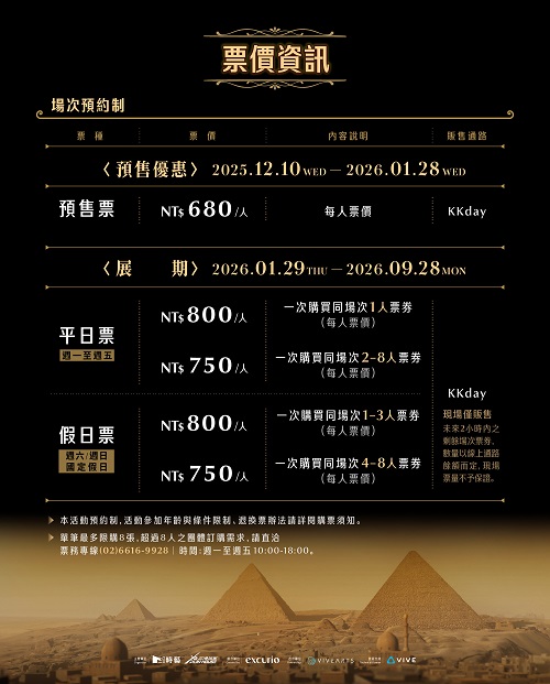 (台灣TB新聞網/記者楊茱茱)台北全新XR展演空間「XR沉浸玩家」將於2026年1月29日啟用,首場將迎來台灣沉浸式娛樂市場重量級新作《消失的法老》古夫金字塔VR沉浸體驗(The Horizon of Khufu),觀眾只要戴上VR 裝置,即能一秒從台北穿梭至埃及,深入神秘的金字塔核心,體驗一場視覺與體感超震撼的古埃及沉浸旅程。即日起,預售票680元(原價800元)於KKday獨家販售!