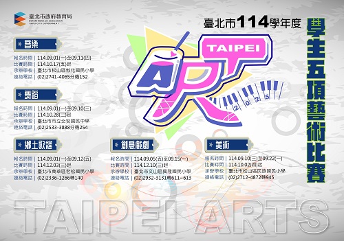 五項藝術比賽不僅是學生揮灑才華的舞台,更是他們將平日努力化為光芒的時刻,每一次上台,都是青春最動人的篇章;每一次掌聲,都是師長最真摯的鼓勵。各項賽事將自10月2日起開跑,詳細賽程可於9月26日起至台北市五項藝術比賽專屬網站查詢,期待每位學生都能發揮精湛的演出,創造無限的藝術可能!