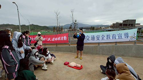 活動首先由張靖漪主任講授急救技巧,示範心肺復甦術(CPR)與自動體外心臟去顫器(AED)操作,強化學生面對緊急狀況的應變能力。接著,陳忠傑組長以實際案例說明交通意外常見型態與防範要領,提升同學交通安全意識;鄧文鈞組長則進一步指導乘車安全與防災演練,培養學生臨危不亂、冷靜應對的素養。