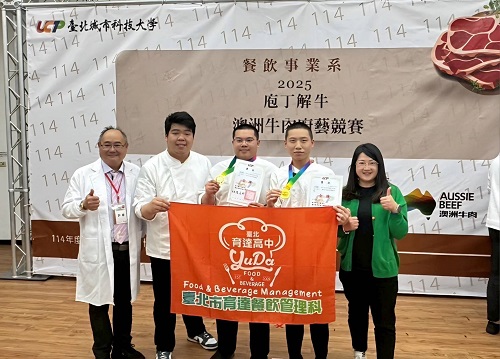 (台灣TB新聞網/資深記者劉志成)臺北育達高中餐飲管理科於「2025 庖丁解牛—澳洲牛肉廚藝競賽」再度展現亮眼實力,在眾多選手中脫穎而出,由 382 辛昶毅、382 陳元銘兩位同學攜手以紮實技巧與創意美味,榮獲高中職組金牌佳績,展現育達餐飲扎實的專業訓練與新生代廚藝實力。此次比賽由臺北城市科技大學餐飲事業系主辦,以「澳洲牛肉」為核心食材,旨在激發選手在修切、火候、風味設計與擺盤上的整體能力,培育能兼具創新與市場競爭力的專業料理人才。
