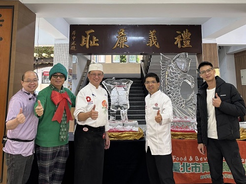 (台灣TB新聞網/資深記者劉志成)台北育達高中餐飲科一年一度的冬季盛事「大師冰雕秀」於上週五盛大舉行,再次邀請香格里拉台北遠東國際大飯店的賴龍柱師傅與潘志豪師傅到校示範冰雕藝術,並由台北城市科技大學周景堯教授擔任現場專業講解。業界大師以國際級技藝,為餐飲科學生帶來震撼又充滿啟發的實作體驗。