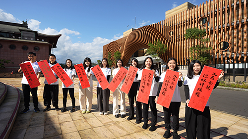 圖1,靈鷲山龍樹學員手拿2026年春聯墨寶,祝福大家馬年平安。(圖由靈鷲山佛教教團提供)