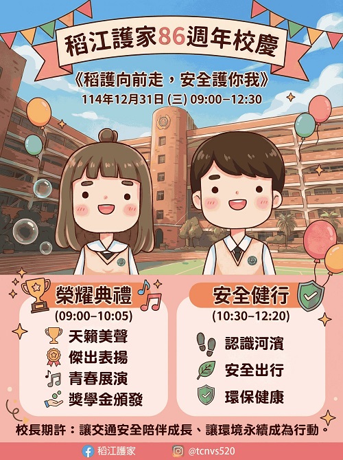 本次校慶活動由全校教職員共同籌備,並邀請家長會參與盛會。期待透過典禮與健行活動,讓學生體會團結、健康與安全的重要性,為稻護86週年留下溫暖而具有教育意義的印記。稻江護家誠摯邀請大家,一同迎接86週年校慶,攜手在「稻護向前走,安全護你我」的精神下邁向下一個亮眼年度。