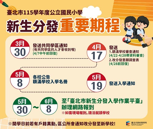 115年3月30日起,各類入學通知單將陸續寄發。首波重點為「共同學區學校」之選擇,若學區內包含兩所以上學校,請家長於收到通知後,於4月7日中午前完成線上回復;緊接著為家長高度關注的「額滿學校」作業,教育局將於4月10日在官網及作業平台公告名單,設籍於額滿學區之新生家長,在收到審查通知後,請務必於4月22日至4月28日,至學校進行資格審查,各額滿學校將於5月8日正式公告入學名冊。5月底啟動線上輕鬆報到