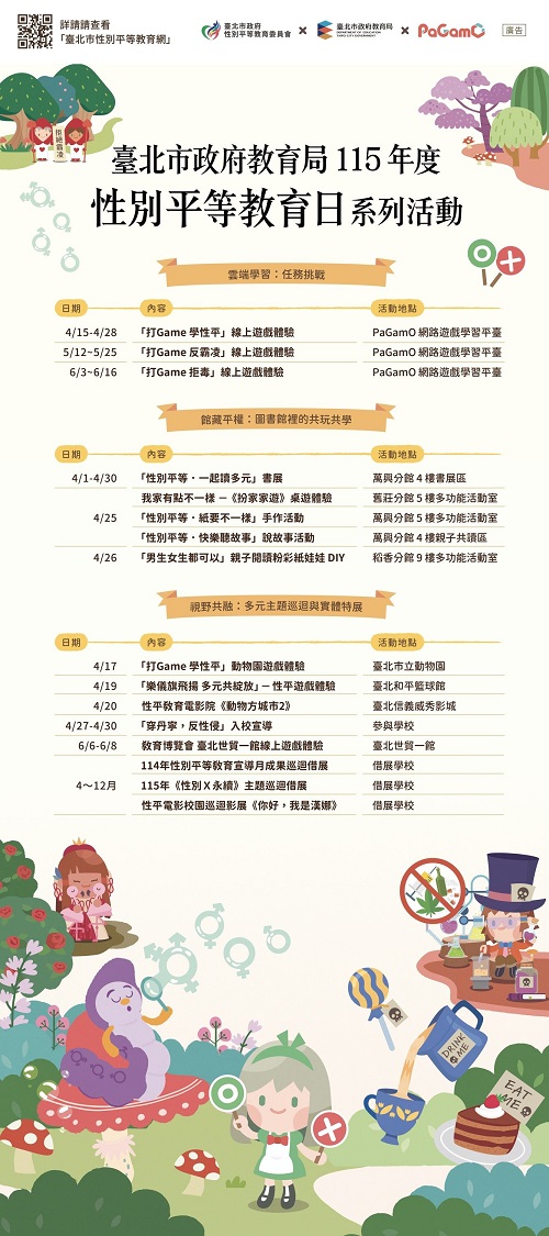 (台灣TB新聞網/資深記者劉志成)為響應教育部「420性別平等教育日」,台北市政府教育局以「愛麗絲的覺醒」為主題,規劃115年度性別平等教育系列活動,象徵學生在探索與提問中看見差異、理解多元,進而反思既有性別框架與人際互動。教育局表示,性別平等教育強調尊重差異,並延伸至反霸凌與拒毒等議題,培養正向互動與自我保護能力,落實安全友善校園。