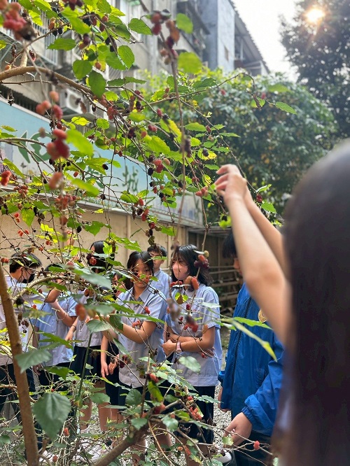 製作雜草粿極需耐心與細膩,不同於傳統主要使用鼠麴草,民權國中使用小田園種植的「地瓜葉」、「桑葚葉」、「艾草」及隨處可見的「酢漿草」、「昭和草」。 學生分工合作,有人負責燙熟葉片,有人揉捻包餡,志工媽媽則協助蒸熟。雅珺老師提醒,「揉捏米糰不能急,過猶不及的平衡感正是品格中『節制』與『恆心』的實踐」。最後安排「敬長共享」環節,讓學生將成品分享給師長、警衛與志工,在分享中學習感恩。低碳里程,邁向淨零排放