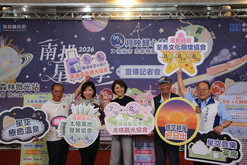 (台灣TB新聞網)由南投縣政府以推廣友善星空生態、觀星主題式旅遊舉辦的「南投星空季」邁入2026年全新年度,14日於縣府大廳舉辦活動記者會。自2019年由國際暗天協會(IDA)正式宣布南投合歡山成為台灣第一個、亞洲第三個獲得國際認證的暗空公園(Dark Sky Parks)後,年年舉辦的「南投星空季」已是南投的年度性指標活動,推陳出新的活動內容更讓遊客期待萬分。這次以「星投列車」為概念,分別於4月25日在信義鄉東埔、6月13日在鹿谷鄉溪頭、8月15日在仁愛鄉清境、9月5日在南投市赤腳精靈景觀餐廳等四個地區推出四場主題日,並與東埔溫泉觀光協會、太極美地發展協會、清境觀光協會、至善文化關懷協會合作推出為期近半年的系列活動,各協會將於主題日前後延伸辦理觀星導覽,讓活動從「單日」擴展為「整月甚至跨季」,例如溪頭地區自5月29日至6月27日每週末辦理觀星導覽,並結合品茗、生態導覽等特色,每場還會提供30份精美報名禮盒;清境地區則自7月30日一路延續至12月,搭配觀星及觀日出追曙光等特色,讓遊客可依時間規劃不同旅遊行程,有效提升停留天數並帶動在地旅宿與觀光消費。