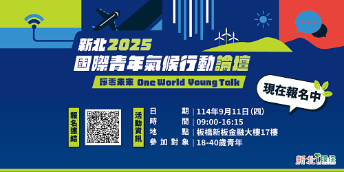 (台灣TB新聞網/記者孫曜樟)新北市環境保護局將在今年 9 月 11 日於板橋新板金融大樓 17 樓舉辦「新北 2025 國際青年氣候論壇」,自即日起至 9 月 5 日開放報名(額滿即止),預計招募 100 位關注氣候與永續發展的青年參與。此次論壇主題為「淨零未來 One World Young Talk」,邀請來自日本、韓國、美國、加拿大等地的氣候專家及青年行動者,以「青年氣候行動四大階段」為主軸,展開跨國交流分享。