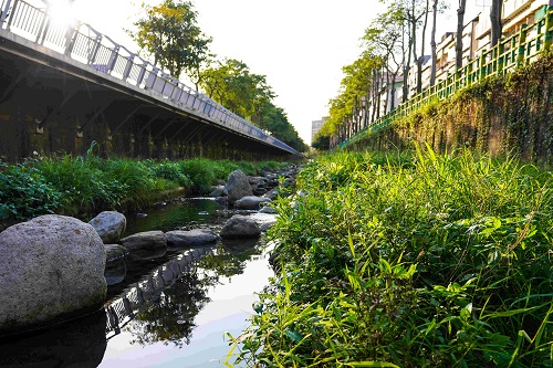 藤寮坑溝的排水水環境改善計畫分為兩期執行,第一期自民國109年至111年,完成了中正三橋至嘉慶橋段的改造;第二期則於民國112年至113年間,接續完成嘉慶橋至延吉橋段。施工期間,團隊運用砌石工法創造出蜿蜒的河道與急、緩流等多元水文變化,並設置原木壩及擾流工,更在渠底增設十處深潭,為魚類等水生動物提供理想的棲息地,成功串聯起兩期工程的水域,維持了生態場域的完整性。