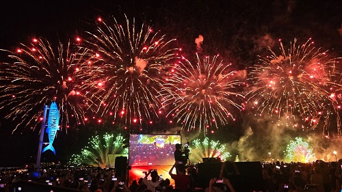長達十分鐘的高空煙火秀以「戀人之橋」為主題,將牡丹、大麗與大量斑千輪等繽紛花火灑向夜空,營造出空中花雨的浪漫景象,照亮了淡水河口,讓在場民眾目不轉睛。煙火施放後,市長侯友宜致詞時表示,民歌的傳承如同各項市政建設,他有責任一棒接一棒地做好,並持續發揚光大。他強調,從年輕學子重新詮釋老歌,到淡水從昔日商港逐步落實淡海輕軌、淡北道路及淡江大橋等建設,皆是「傳承」的體現,美好的事物就應該被延續下去。