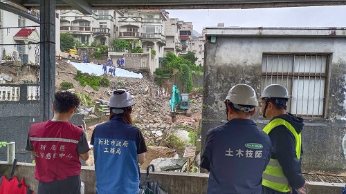 工務局調配人力與機具持續進行降土壓清坡作業,技師公會全力協助搶災工作。大地技師公會技師芮嘉航及新北土木技師公會理事長丘達昌在清晨5點接獲通知後立即到場監控環境變化。
