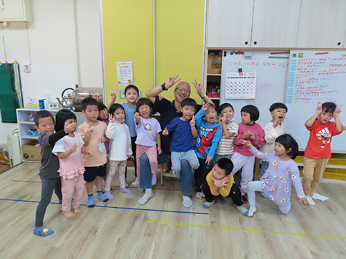 蕭老師早年從事表演藝術,後自學英語與武術,並投入動畫製作領域,展現跨界整合的斜槓精神。他以自身經歷為教材,將語言、肢體與藝術巧妙融合,讓孩子們在故事、動作與創作中自然學習。課堂上,蕭老師以繪本故事為主軸,搭配簡單的節奏律動與手勢遊戲,讓孩子們在聽、說、唱、動的多感官體驗中學習語言,孩子在自然互動中學習英語,從問候語、動物名稱到生活用語,孩子們在笑聲中開口說英語,學習效果顯著。課程中,孩子們不僅學會新單字,也學會專注傾聽與合作分享。
