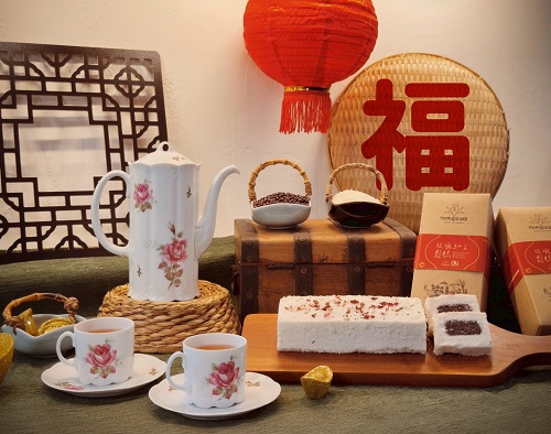 圖 /理想大地與雅理藝術文化基金會合作,推出公益限定甜點「玫瑰紅豆鬆糕」。_春節活動連番登場 水岸市集、音樂互動、煙火秀不間斷