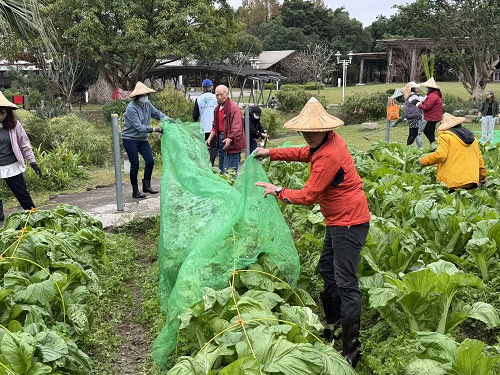 圖 /眾人一起掀開防蟲網準備採收野菜學校分享大地美味 芥菜田三月換妝水稻田