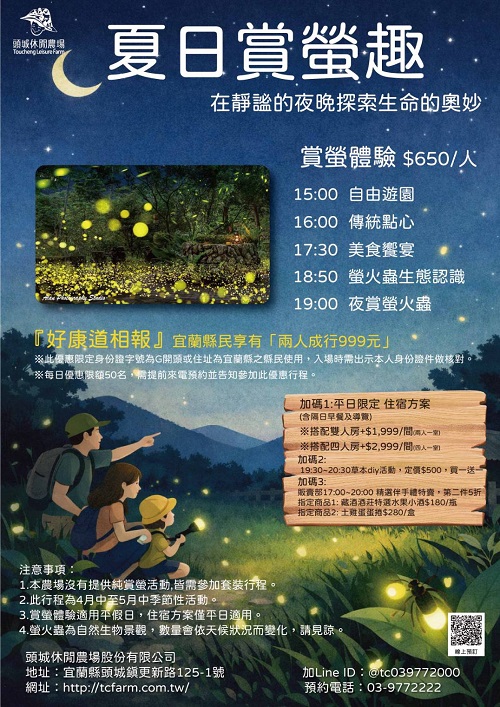 ★ 行程方案:『頭城休閒農場 夏日賞螢趣專案』驚喜加碼1-2-3活動 ★ 適用日期:即日起~2026/4/15~5/15 ★ 賞螢體驗$650/位: 遊園+迎賓傳統小吃點心+自助式晚餐+賞螢趣。 15:00自由遊園與傳統點心、17:30美食饗宴、18:50螢火蟲生態講座、19:00夜賞螢火蟲