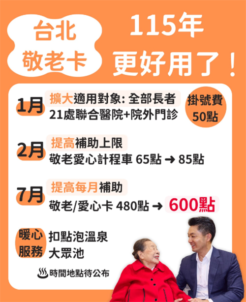 (台灣TB新聞網/記者陳信宏)台北市的長者又多點福利了!在市議會藍綠白議員一致要求下,市長蔣萬安宣布,自115年7月起,敬老愛心卡升級,點數由480點加碼至600點,且使用範圍繼續擴大,不排除今年冬天長者也可拿敬老卡「泡湯」,舒展筋骨暫解疲憊。